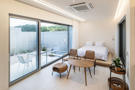 P1 객실17평 총42평 / 개별 자쿠지, 4계절 미온수풀로 운영 됩니다(미온수요금 객실요금에 포함됨,온수온도 32~35도, 동계기간은 입실시부터 저녁 7시까지 유지) / 수영장 오프 시즌(11월~4월 초순) 데크로 덮어 운영중 / 기준 2인 / 최대 4인